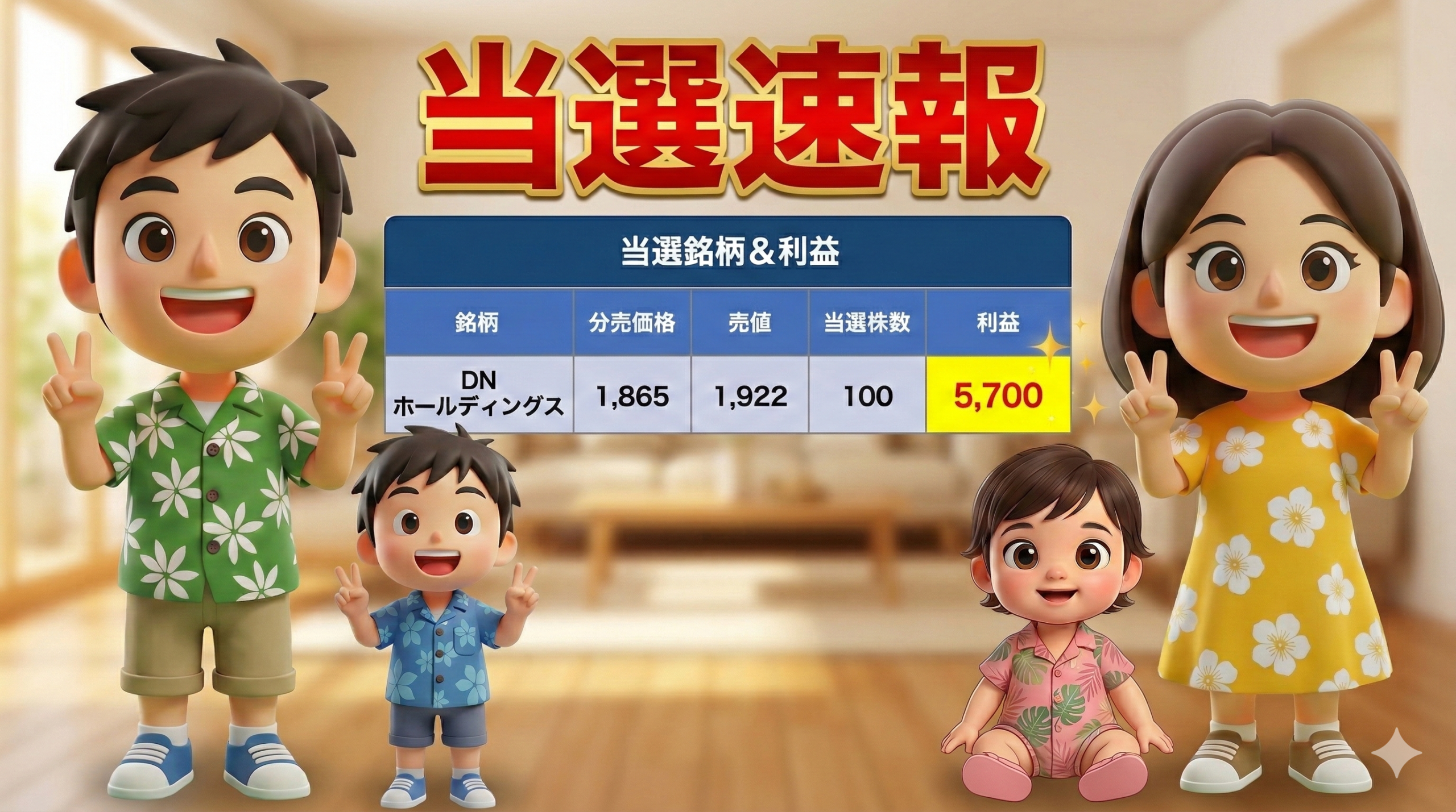 【当選速報】DNホールディングスの立会外分売で+5,700円|2026年は2銘柄目の当選