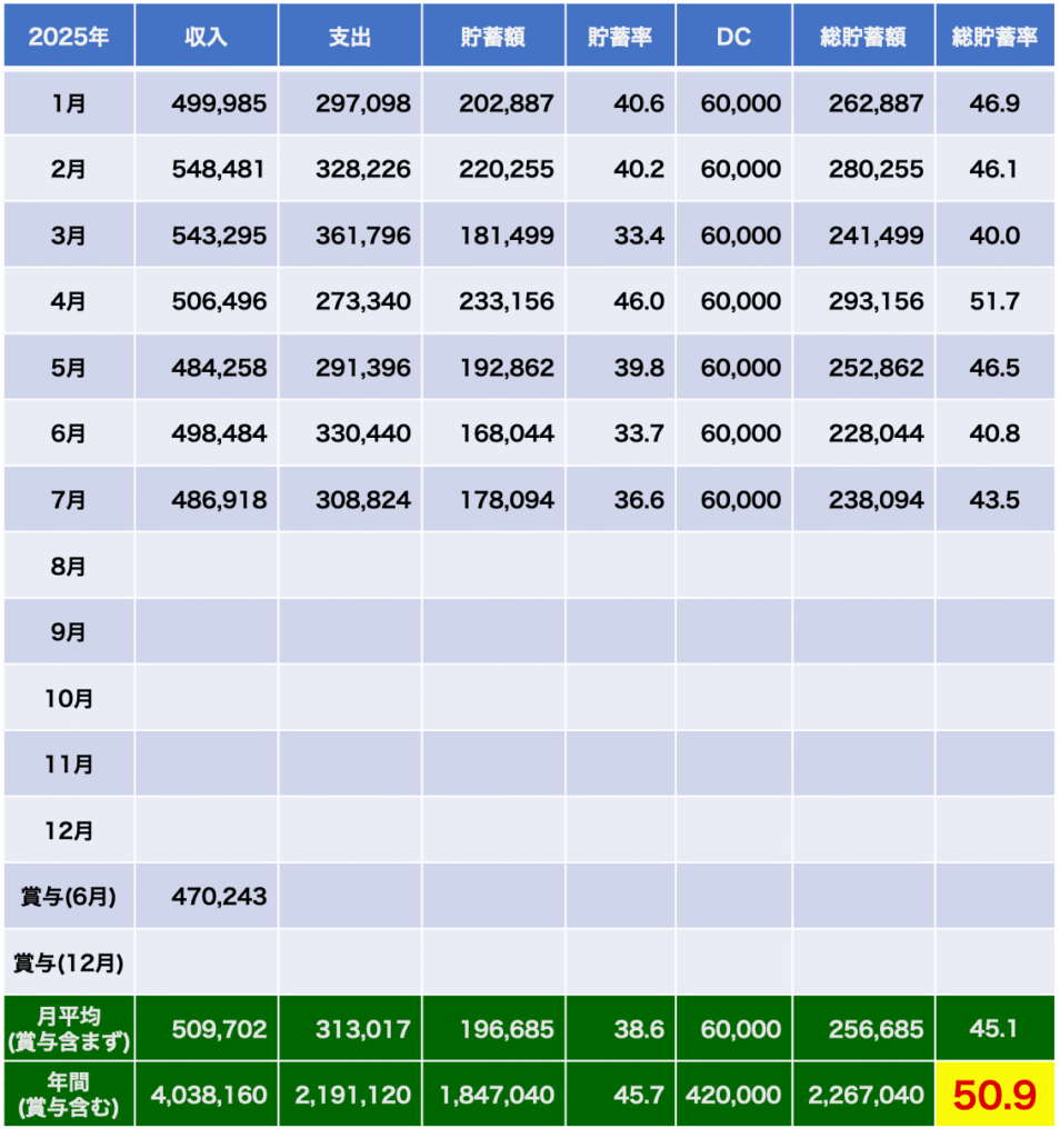 7月の家計簿チェックが終わったところで、2025年の月間平均貯蓄率と年間貯蓄率は以下となっています。