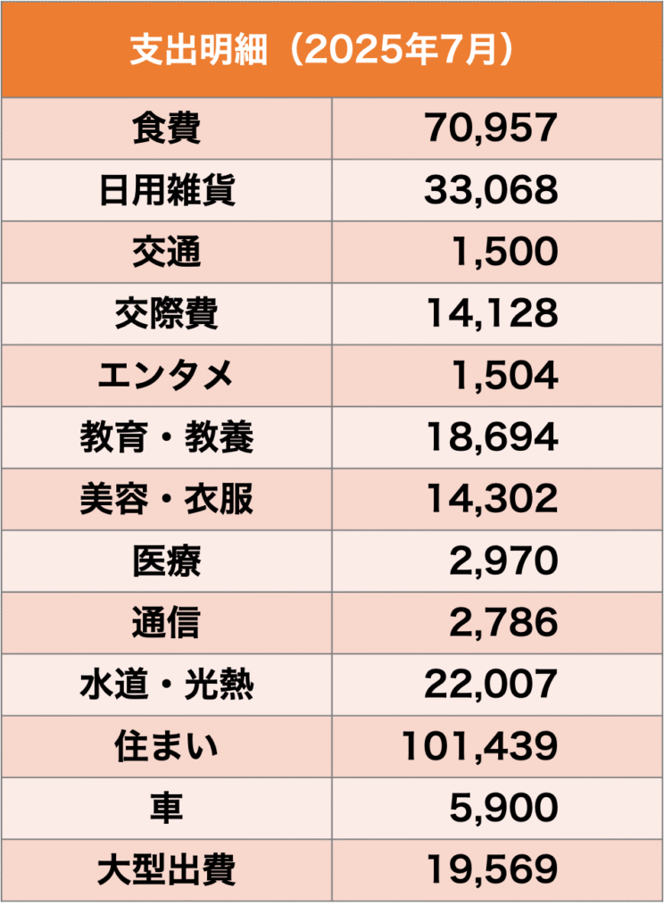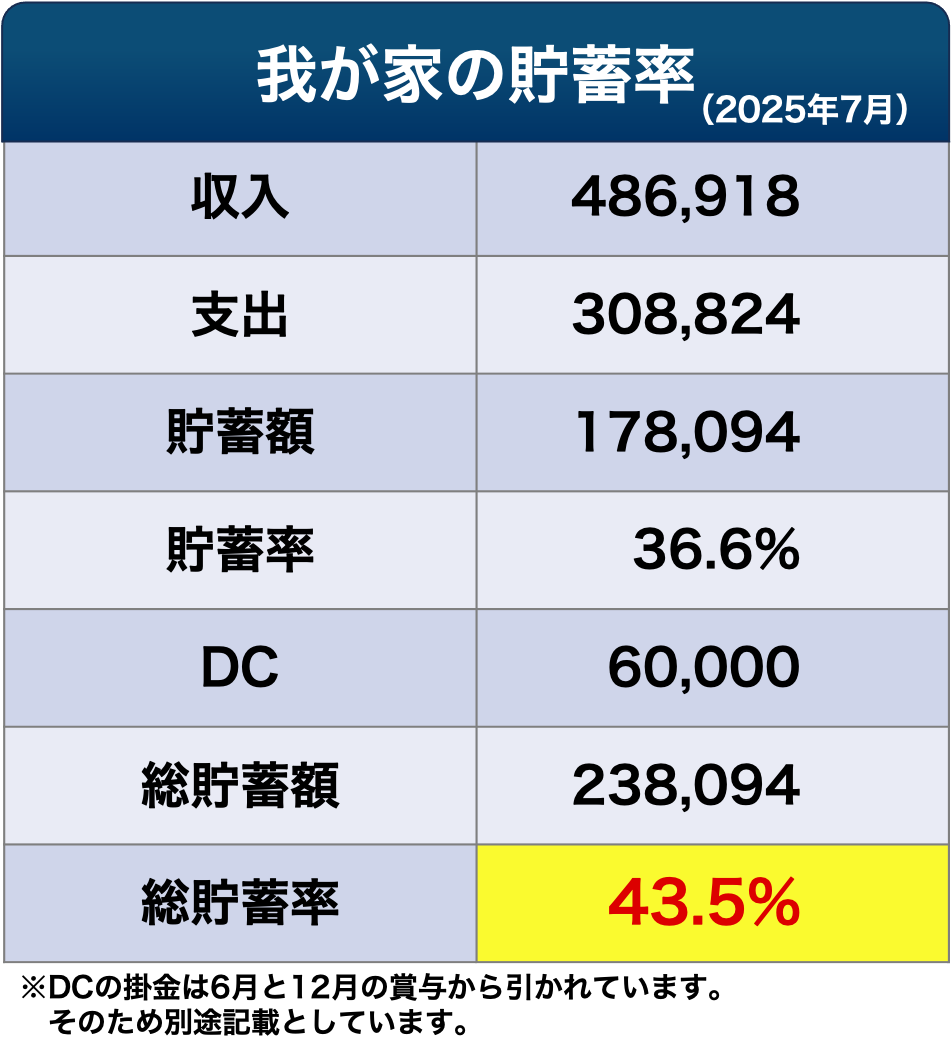 さて、2025年7月の家計状況ですが、総貯蓄率は43.5%でした。収支の詳細を以下にまとめます。