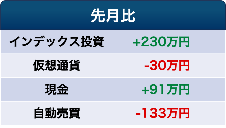 先月比で見ると、インデックス投資が+230万円と大きく伸びています。自動売買はトライオートETF(ナスダック100トリプル)の建玉が全て決済されたので、いったん資金を引き出しました(約100万円)。トラリピの含み損増も影響しています。