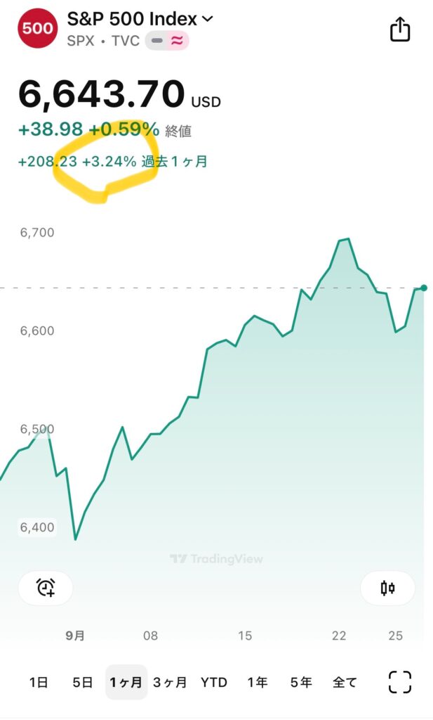 集計時点(9/27)で、我が家が主に投資しているS&P500は1か月で3.24%上昇していました。