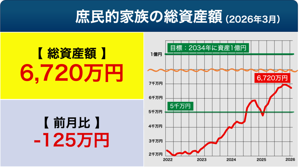 - 3月の総資産額:6,720万円(前月比-125万円)。3か月連続での減少。