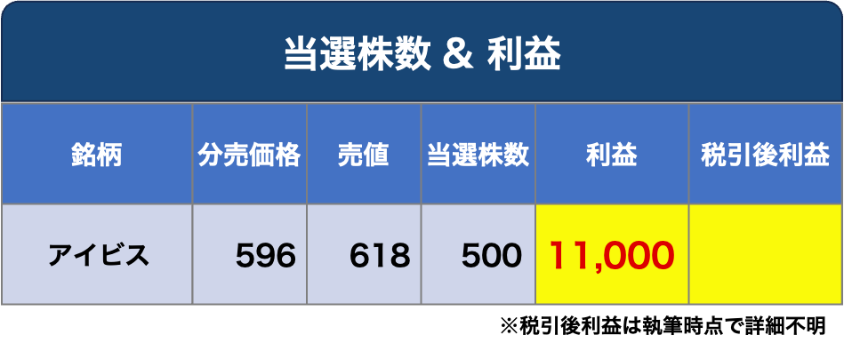 さて、本日は2026年1発目の「立会外分売」に当選したのでご報告です。当選銘柄は「アイビス」。当選株数と利益の詳細は以下です。