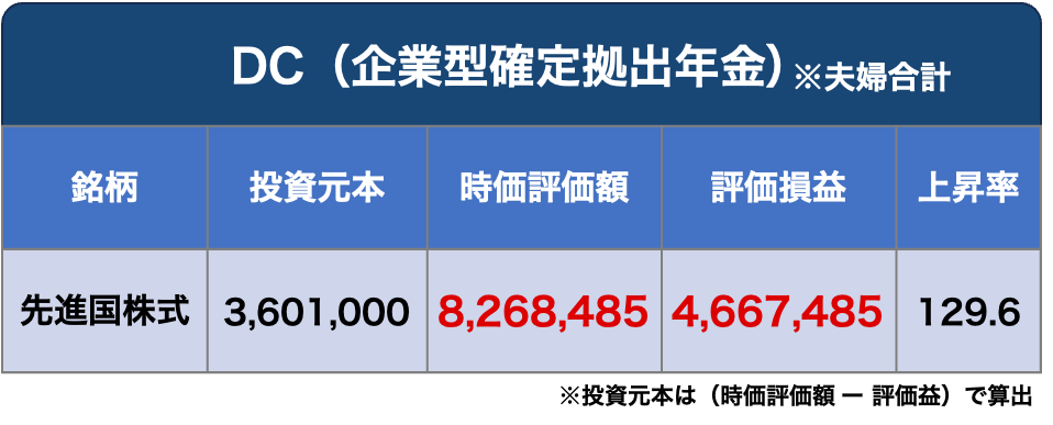DC(企業型)の成績にご注目ください。 上昇率は驚異の129.6%。評価益だけで+460万円を超え、いわゆる「ダブルバガー(資産2倍)」を達成しています。