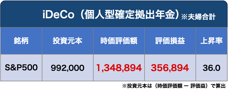 iDeCoの方も、毎月夫婦で4万円(各2万円)をコツコツ積み立ててきた結果、評価益は+35万円を突破しました。