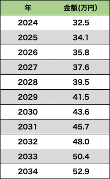 年利5%でIPOや立会外分売を運用した場合、年間32.5万円の利益を生み出してくれます。2024年〜2034年までは11年間ありますので、32.5万円 × 11年間 = 357.5万円の利益を生み出す計算です。
