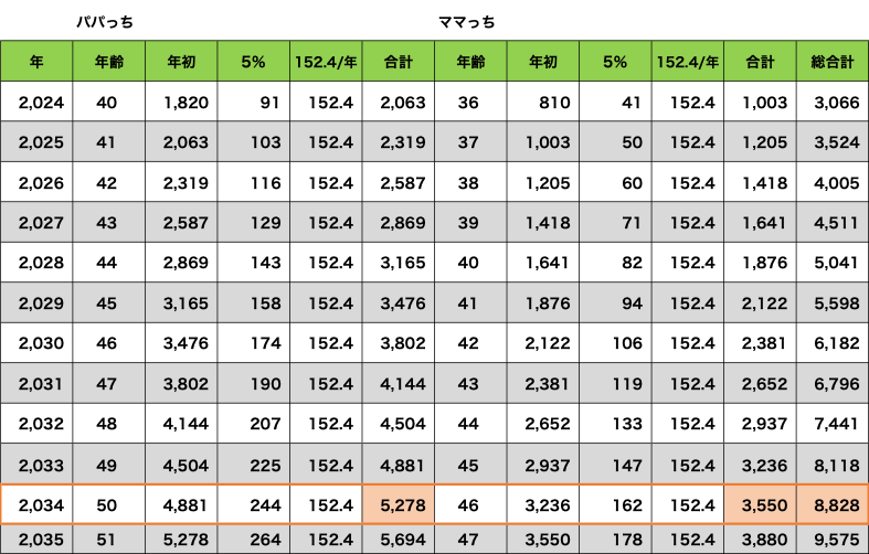 次に、下表はリスク資産の想定推移金額です。年利5%、年間積立投資額152.4万円/人でシミュレーションしました。