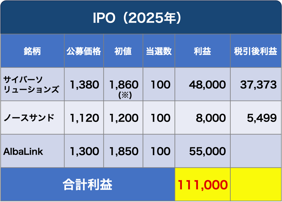 ⚫︎今回の当選・売却で2025年のIPO利益は111,000円となり、10万円を超えました