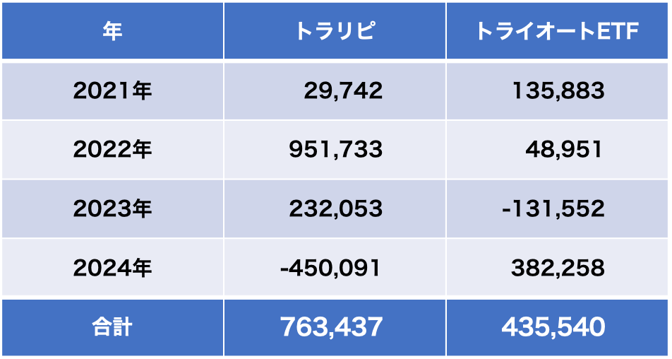 4年間の運用で「トラリピ」は『76万円の利益』「トライオートETF」は『43万円の利益』となっています。