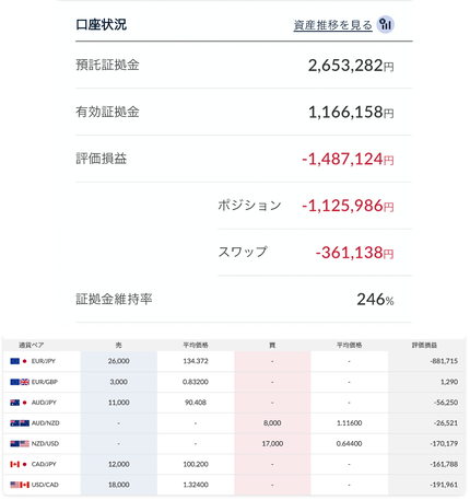特に「トラリピ」はマイナススワップの負担が大きく、執筆時点で評価損益がマイナス150万円(うちマイナススワップ36万円)ほどになっています。2024年のマイナス45万円もスワップ振替によるものです。