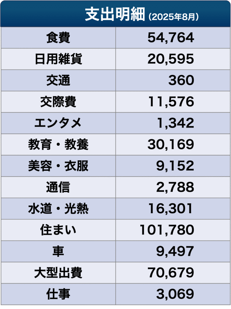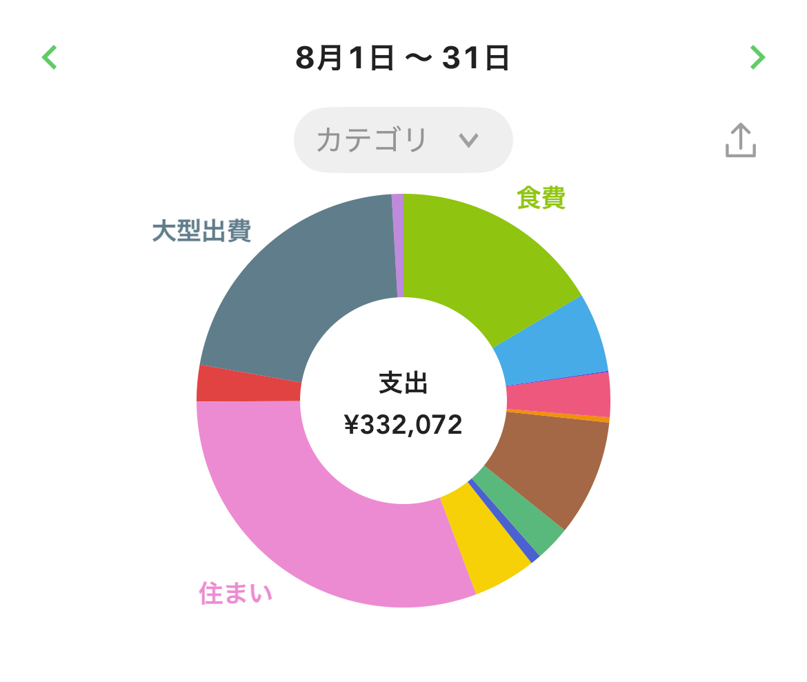 8月の支出は332,072円。3人家族の支出明細は下表のとおりです。