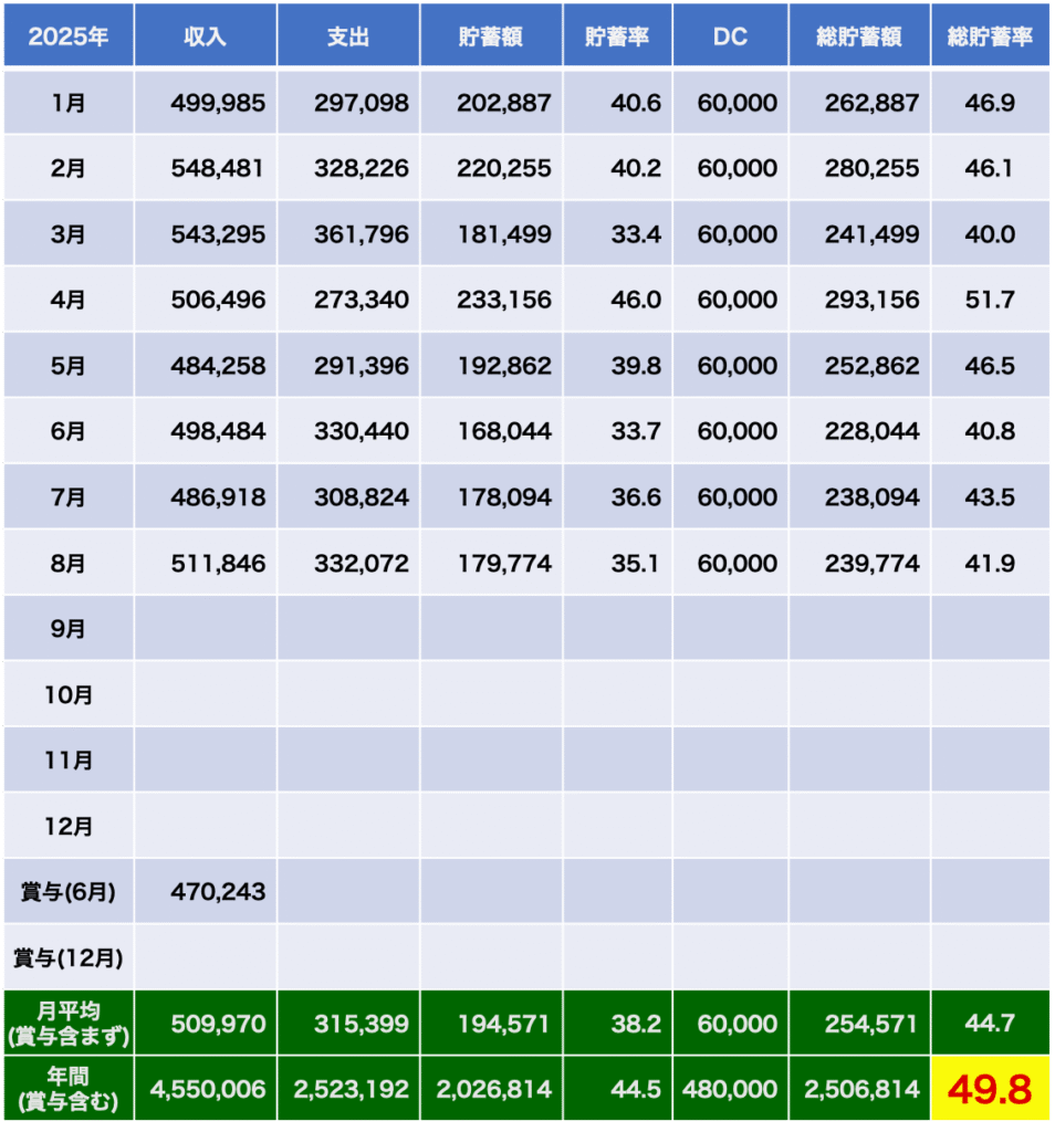 8月の家計簿チェックを終え、2025年の月間平均・年間貯蓄率は下表のとおりです。