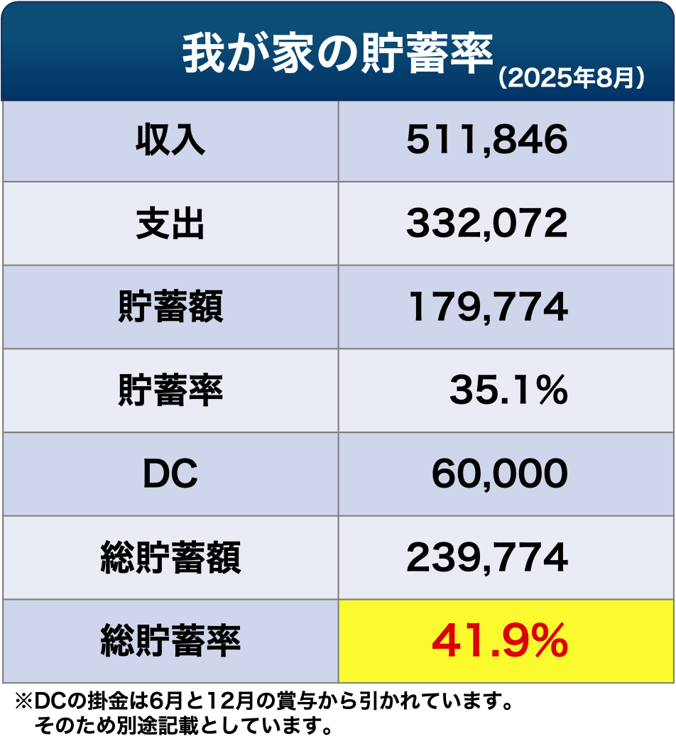 さて、2025年8月の家計状況ですが、総貯蓄率は41.9でした。収支の詳細を以下にまとめます。