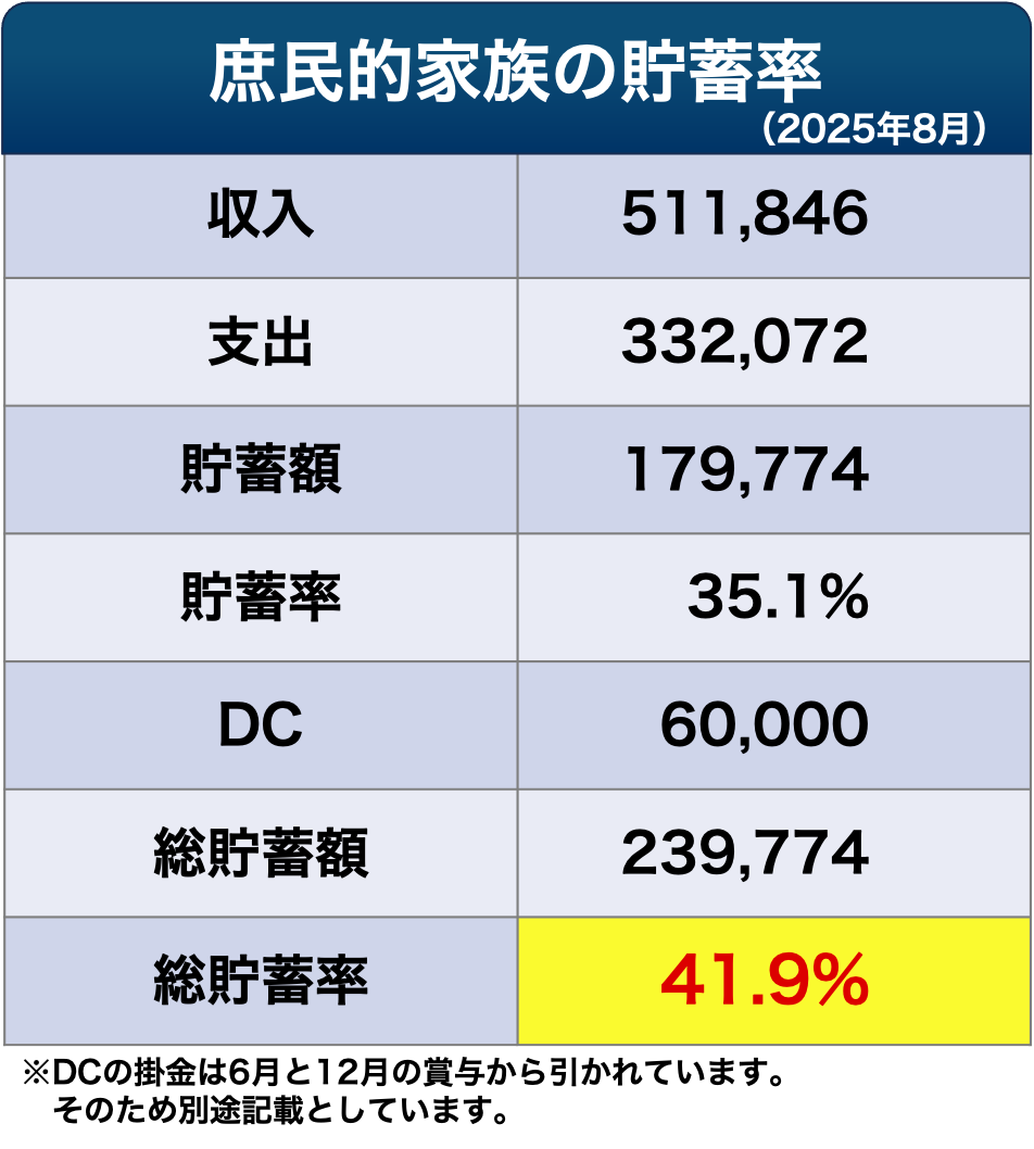 ⚫︎2025年8月の家計簿の見直しを行い、総貯蓄率は41.9%でした