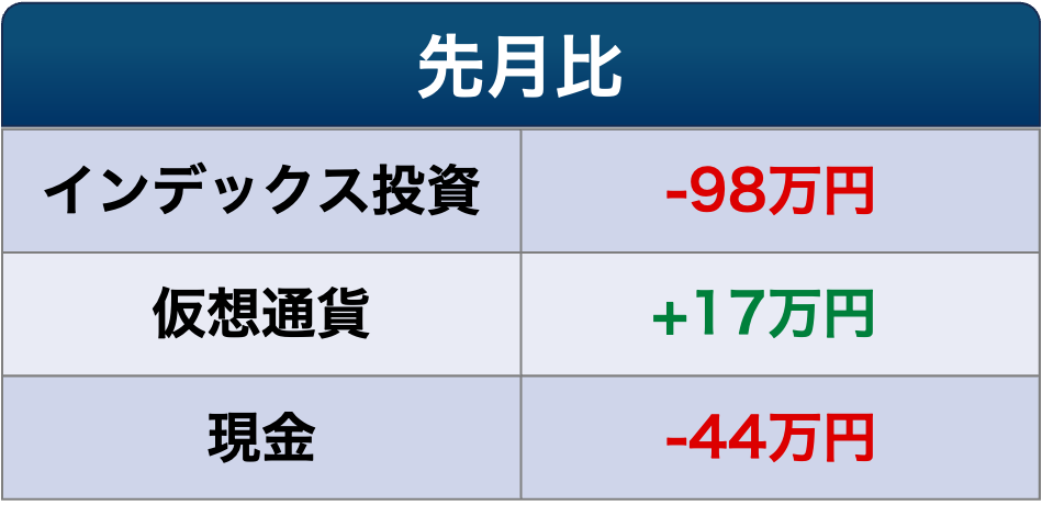 先月比で見ると、インデックス投資額が約100万円の減少。主力のS&P500指数はここ1か月で数%下落していますが、円安により減少幅が抑えられています。