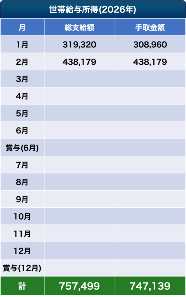 - 2026年2月の給与所得(育児休業給付金)は夫婦合計で438,179円