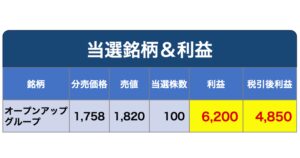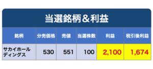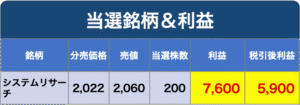 当選銘柄は「レオン自動機」。200株の複数当選をいただき、税引前利益は7,000円でした。マイルール通り「寄付」で売却しました。
