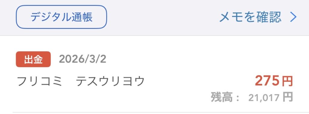 3月に入り、予定通り振込完了メールが続々と届きました。「自動振込完了!ラクだった〜!!」と喜びながら入出金履歴を確認すると、そこには「フリコミ テスウリョウ 275円」の表示が……。